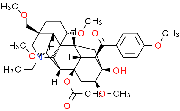 其他事项 产品中文名称:草乌甲素英文名:BulleyaconitineA英文别名:Methanone,[(1,6,14,16)-8-(acetyloxy)-20-ethyl-13-hydroxy-1,6,16-trimethoxy-4-(methoxymethyl)aconitan-14-yl](4-methoxyphenyl)-,CAS登录号:107668-79-1分子式:C35H49NO9分子量:627.77536分子结构: