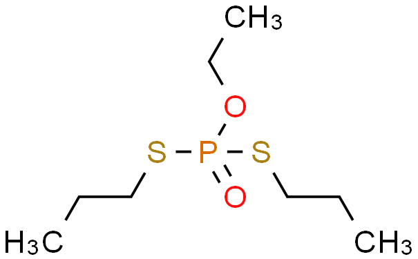 | 理化性质 | 性质:淡黄色透明液体。沸点86-91℃(26.7Pa),相对密度1.094(20/4℃),26℃的蒸气压为0.0467Pa、25℃水中的溶解度750mg/L,溶于多数有机溶剂。在酸性介质中很稳定;在常温碱性介质中发生水解,温度高时,水解加快。对光稳定。 制备方法:由三氯氧磷与无水乙醇反应,生成乙氧基磷酰二氯,再与丙硫醇在氢氧化钠存在下反应制得丙线磷。 用途:丙线磷为一种高效、触杀性防治线虫和地下害虫的土壤杀虫剂,对马陆、蜈蚣等多足动物也有效。防治麦类孢囊线虫、花生的各种线虫、甘薯线虫、马铃薯线虫及花卉线虫均有良效。 |
